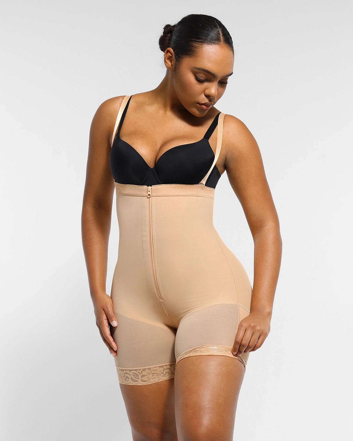 4. Para fechá-lo, prenda os ganchos internos de baixo para cima e feche o zíper. Se for de busto aberto, o modelador deve ser colocado para circundar o sutiã na parte inferior.