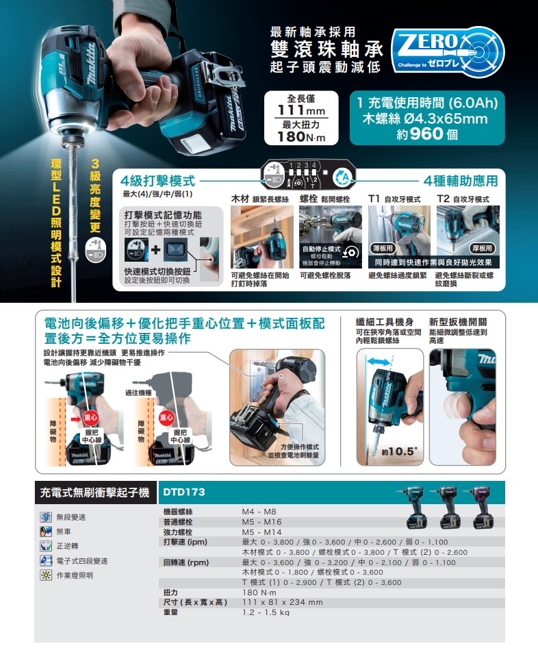 12分鐘前台灣現貨【MAKITA 牧田】 18V鋰電無刷衝擊起子機(DTD173) 日本製 強勁動力 - DTD173【1電1充+塑箱+鑽頭配備】