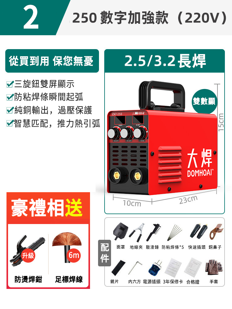 2分鐘前業內焊機領軍品牌【德國DOMHOAI】全新二代數字化電焊機,瞬間起弧,長焊4.0焊條 - 【250-220V】數字加強款+基礎套餐