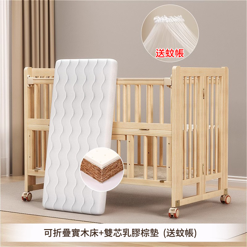 25分鐘前陪伴寶寶成長,永不閒置【嬰兒床-->遊戲床-->書桌】日本超火の可折疊嬰兒床,實木無漆更安心,可拼接大床+滑輪移動,多功能設計陪寶寶成長! - 【118*68*85cm】折疊大床+五件套+棕墊+蚊帳